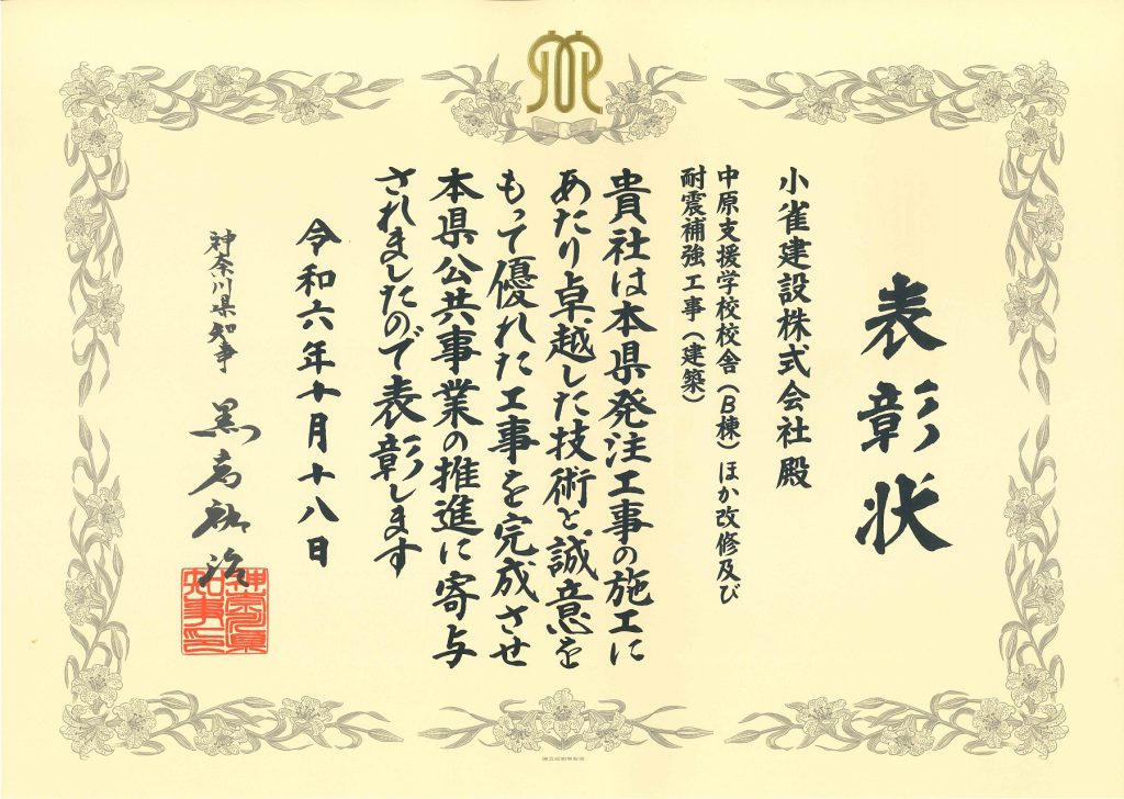 神奈川県県土整備局長より優良工事等局長表彰を賜りました。