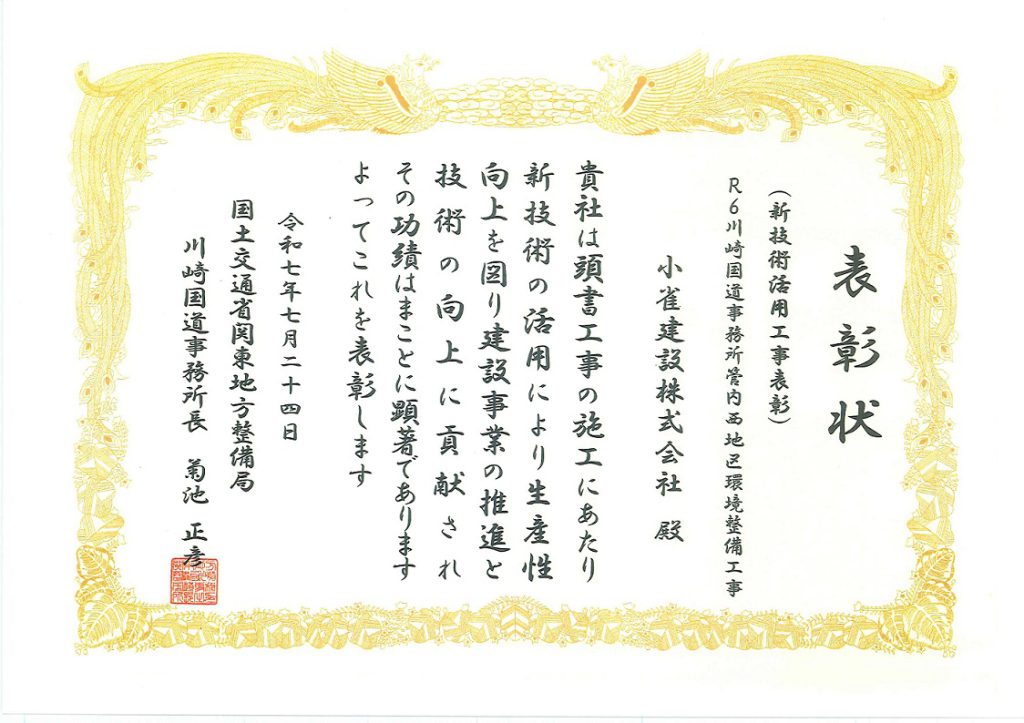 令和7年7月24日 国土交通省関東地方整備局 川﨑国道事務所長菊池正彦様よりR6川崎国道事務所管内西地区環境整備工事にて「優良工事表彰」「担い手の確保・育成貢献工事表彰」「新技術活用工事表彰」をいただきました。