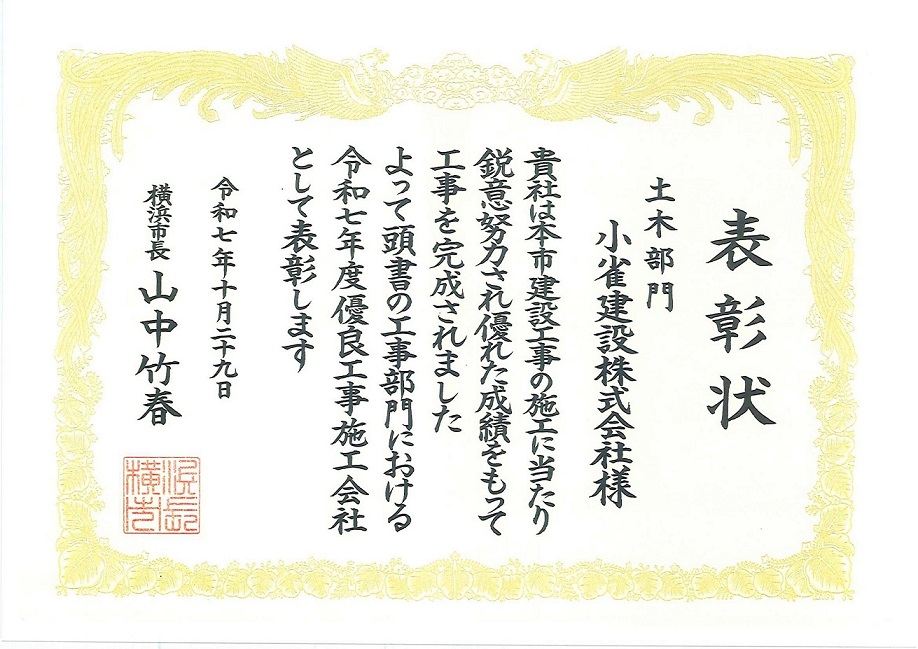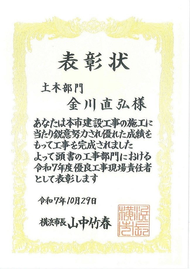 令和7年10月29日、横浜市長 山中竹春様より、令和7年度優良工事施工会社として表彰状をいただきました。