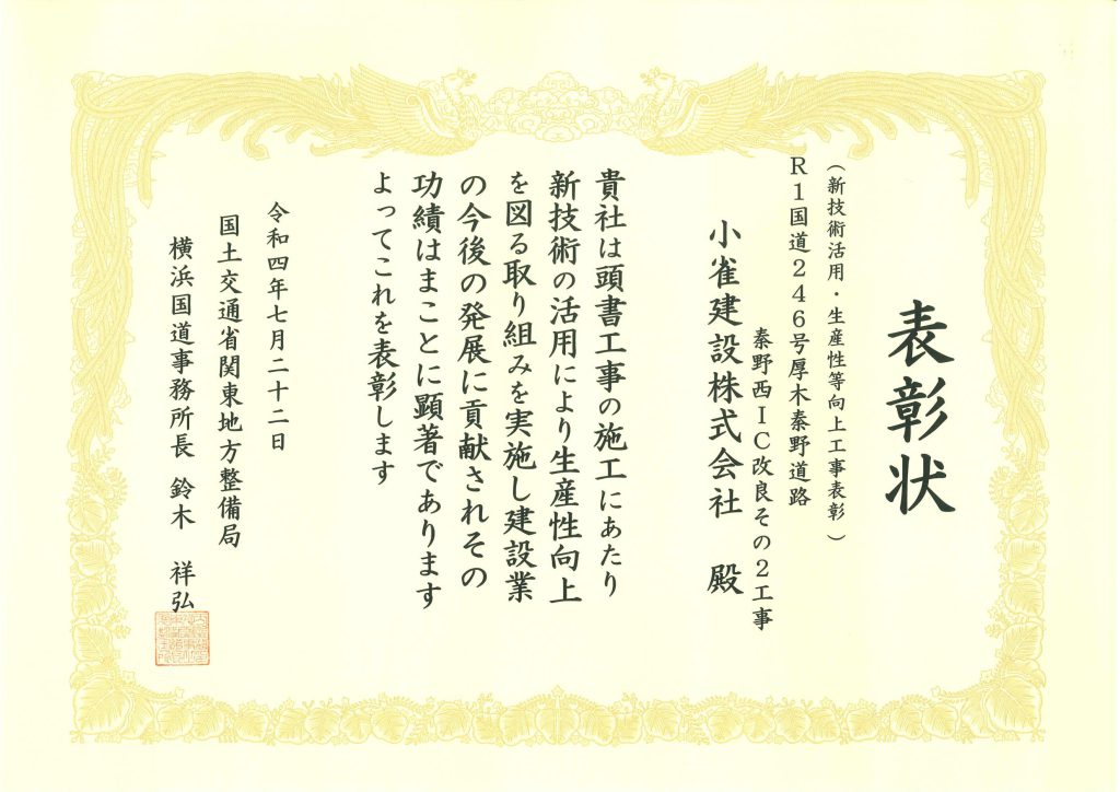 国土交通省 関東地方整備局 横浜国道事務所長 鈴木 祥弘様より「新技術活用・生産性等向上工事表彰」を受賞しました。