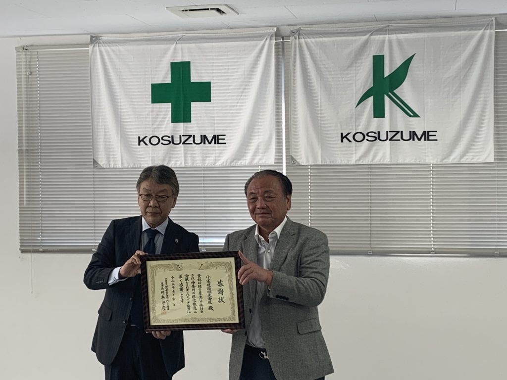 NEWS 緑の募金感謝状授与されました。 2023年11月28日 令和5年11月20日、森林整備などに活用される「緑の募金」へ多額の寄付をしたとして、公益財団法人かながわトラストみどり財団の新井専務理事より感謝状をいただきました。 今後も引続き、活動に取り組んでまいります。