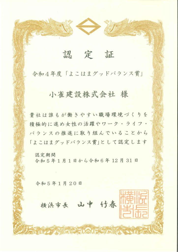 よこはまグッドバランス賞とは、男性も女性も働きやすい職場づくりやワークライフバランスの推進を行っている事業者に対して、横浜市がその取り組みを評価した事業者が認定される賞です。