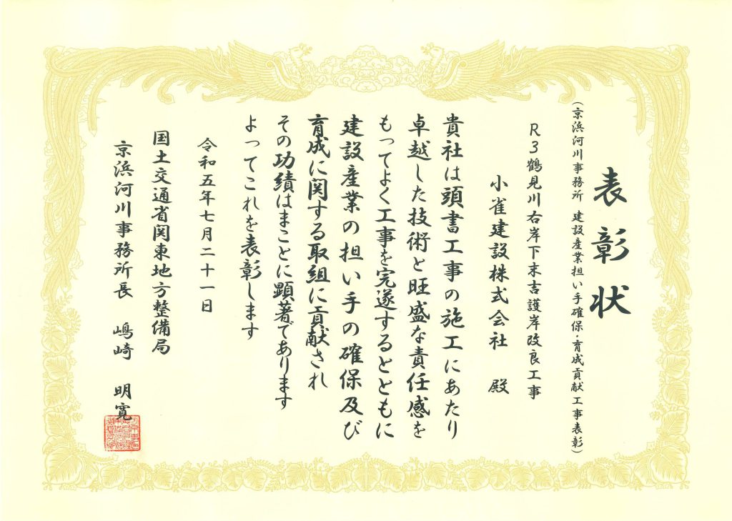 NEWS 国土交通省 関東地方整備局 京浜河川事務所 建設産業担い手確保・育成貢献工事表彰 受賞 2023年07月24日 国土交通省 関東地方整備局 京浜河川事務所長 嶋崎 明寛 様より「建設産業担い手確保・育成貢献工事表彰」を受賞しました。