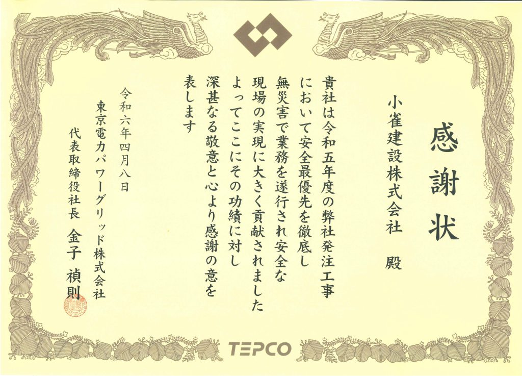 東京電力パワーグリッド株式会社 代表取締役社長 金子禎則 様より「安全表彰(感謝状)」を受賞しました。