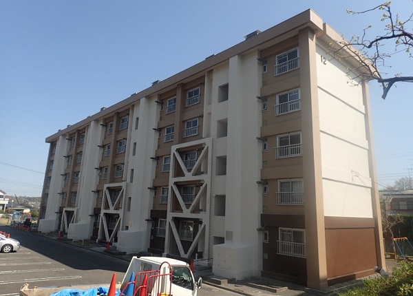 建築工事 二宮第1・4共同住宅耐震改修その他工事 共同住宅 官公庁 工期 H28.3 構造 RC造5階建て4棟・RC造4階建て1棟 建築面積 1590.16m2 延べ床面積 7600.33m2 用途 共同住宅