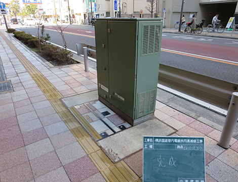 土木工事/インフラ設備 横浜国道管内電線共同溝補修工事 国土交通省 概要 国土交通省横浜国道事務所管内4箇所(三ッ沢上・下町、保土ヶ谷警察署前、磯子土木事務所前、茅ヶ崎駅前交差点)の電線共同溝の補修した工事です。 工期 H26.4.24~H27.2.27