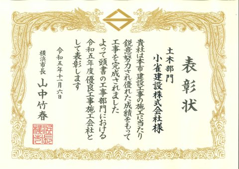 横浜市長 山中 竹春 様より「優良工事施工会社表彰(土木部門)」を受賞しました。
